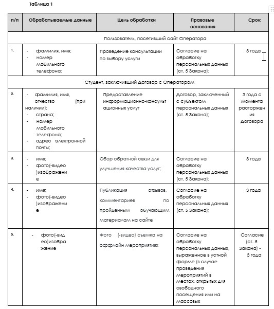 3.8. Оператор осуществляет хранение персональных данных в форме, позволяющей определить субъекта персональных данных, не дольше, чем этого требуют заявленные цели обработки персональных данных в соответствии с Таблицей № 1.