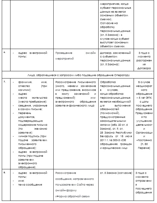 - в отношении распространенных ранее персональных данных до момента заявления субъектом персональных данных требований о прекращении обработки распространенных персональных данных, а также об их удалении при отсутствии иных оснований обработки персональных данных, предусмотренных законодательством Республики Беларусь;